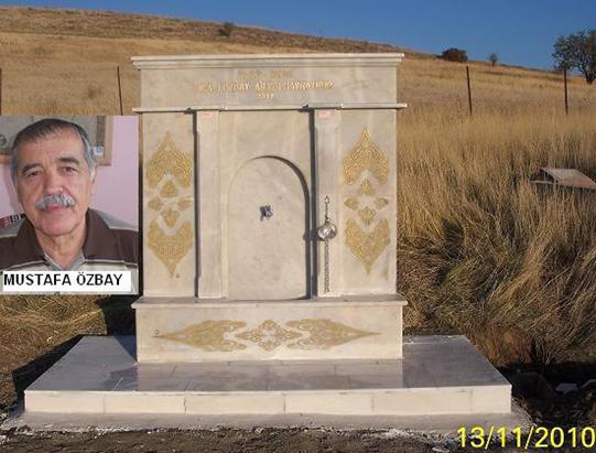 Sayın Mustafa Özbay’nı Mayıs 2010 tarihinde Malatya’da Dernek Başkanımız Abbas Genç’le görüşmeleri sırasında köy mezarlığına bir çeşme yapma fikrinin olduğunu bunu gerçekleştirmek istediğini paylaşmıştır. Kurban bayramı öncesinde temeli atılan çeşme Köy muhtarımız ve bazı köylülerimizin iş gücü destekleriyle kısa sürede tamamlanmış ve şu anda çeşmesinden su akar vaziyette teslim edilmiştir.